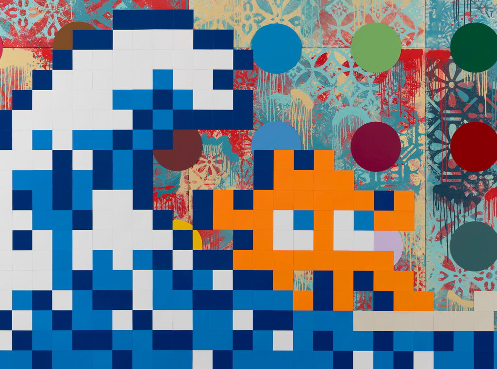 The works celebrate both the individuality of each artist and the synergy that occurs when their practices collide. Familiar motifs, such as Fairey’s OBEY iconography, Hirst’s spots and cabinets and Invader’s space mosaics, have been reconfigured in provocative and playful ways that challenge the boundaries between fine art and street culture.