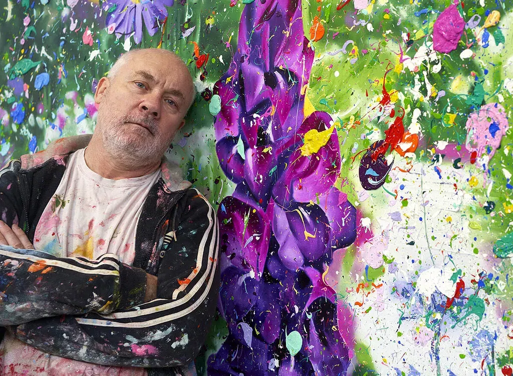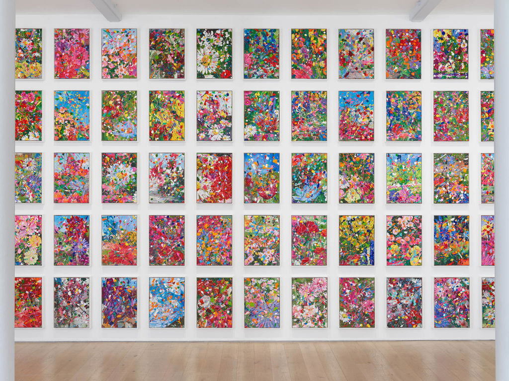The flowers, executed in quick yet recognisable detail, are overlayed to various degrees with thick and colourful splatters of paint, which Hirst characterises as “like pollen, or something that feels like an assault on the senses.” In the flourishing scenes of Hidden Gardens, the interrelation between humanity and the environment emerges as an important theme – Hirst said that he wants these works “to feel like the hope and futility we get when we try to control nature.”