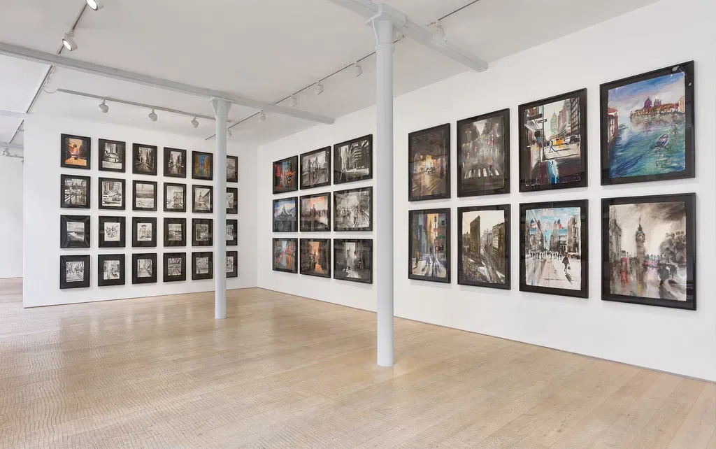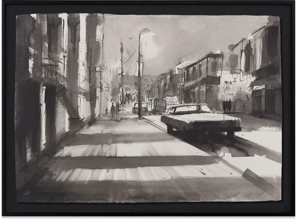 Indian Paper Works features ink and watercolour paintings on handmade Indian paper, ranging from monochromatic to colourful. The works come in various dimensions, and each artwork is signed on the front by the artist. They focus on cityscapes, rendering detailed observations of streets and architectures through impressionistic, flowing lines. Indian Paper Works is made up of delicate washes of paint layered through quick, spontaneous brushstrokes. This technique enhances their emotional impact and adds depth and movement to the compositions. Each piece is presented in a floating frame that highlights the natural, raw edges of the paper.