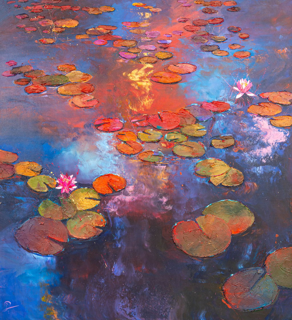 Studio Works features iconic cityscapes of metropolises such as New York and London, seen from sweeping aerial views and immersive street-level perspectives. Kenton brings these scenes to life with bold colour contrasts, capturing the vibrant energy of a street alongside the landmarks of a skyline. In other works, lily ponds and landscapes evoke the tranquillity of nature. In contrast to Indian Paper Works, which purely relies on brushstrokes, these paintings emerge from tactile textures of paint manipulated with tools like brushes and spatulas. The works come in various dimensions, and each artwork is signed by the artist.