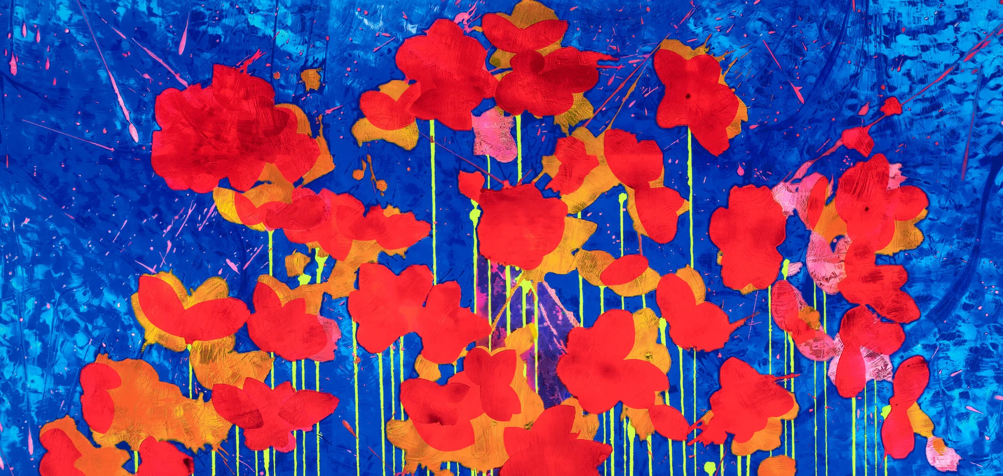 Blazing Devotion is based on a stained glass window from an architectural project installed in Wimbledon, London in 2021. Set against a vivid blue background, poppies hang on thin, dripping stems with translucent scarlet petals.