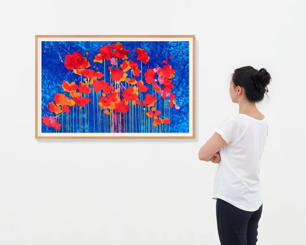 The Blazing Devotion edition is a 25-colour silkscreen print with gloss varnish on Somerset Satin White cotton paper and is presented in an oak frame with Optium Tru Vue Acrylic Glass. The work measures 89.8 x 139.8 cm (framed) and is priced at $2,500 (plus applicable taxes). Each work is numbered and hand-signed by the artist on a label attached to the verso of the frame.
