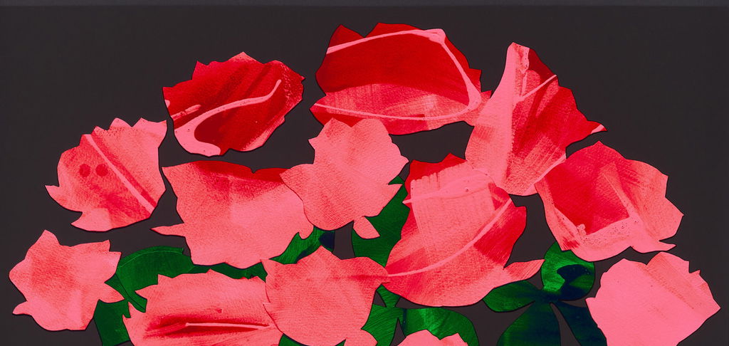 Nocturne in Blue is based on a 2024 work on paper by Clarke, in which he turned to the incredibly intimate format of collage to capture the nature around him. Using his scissors to “draw from life”, Clarke translated elegantly arranged blooming buds onto paper. From a vibrant blue vase, expressive pink flowers and verdant green leaves emerge, the liveliness of their forms emphasised by the visible fluidity of the paint.