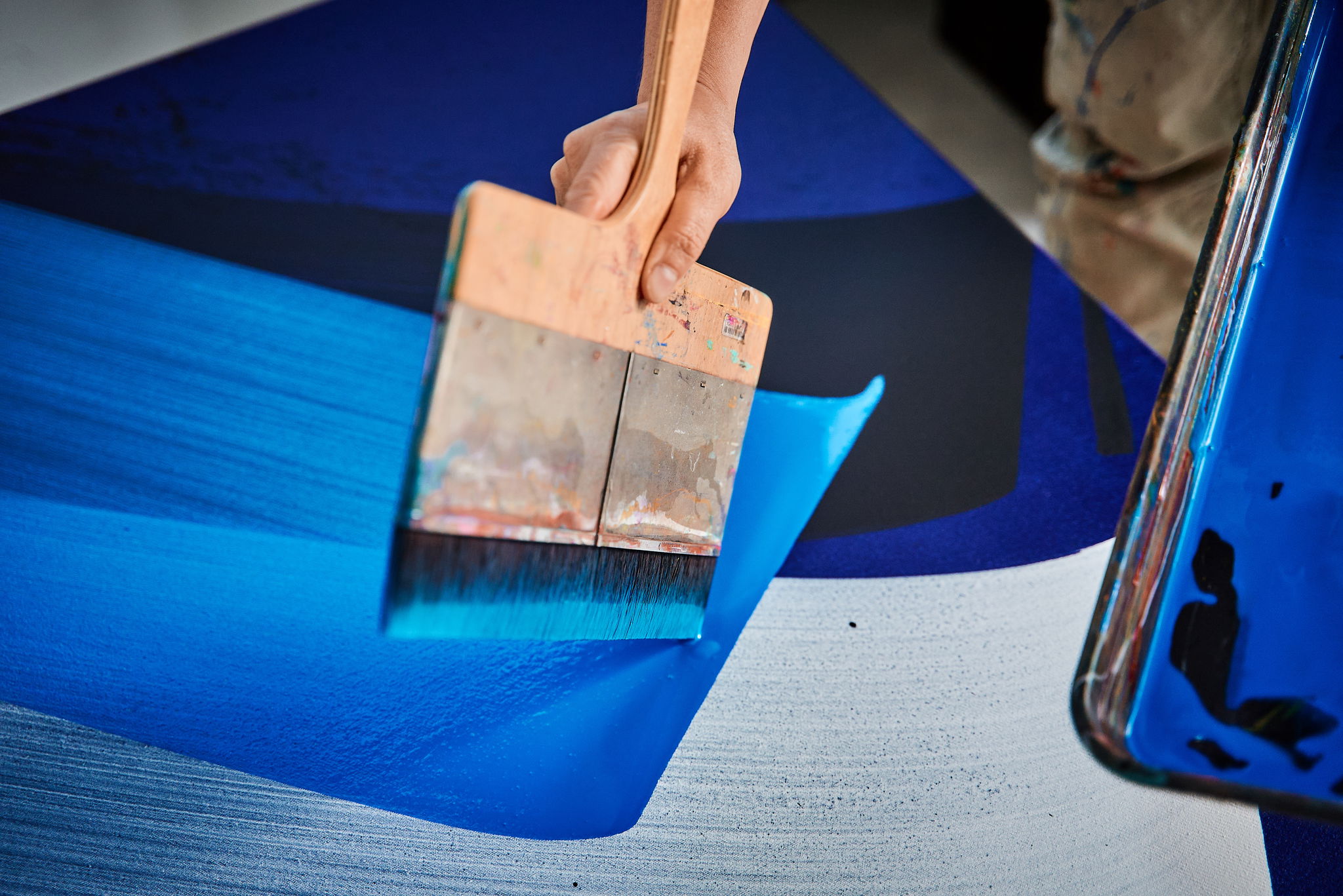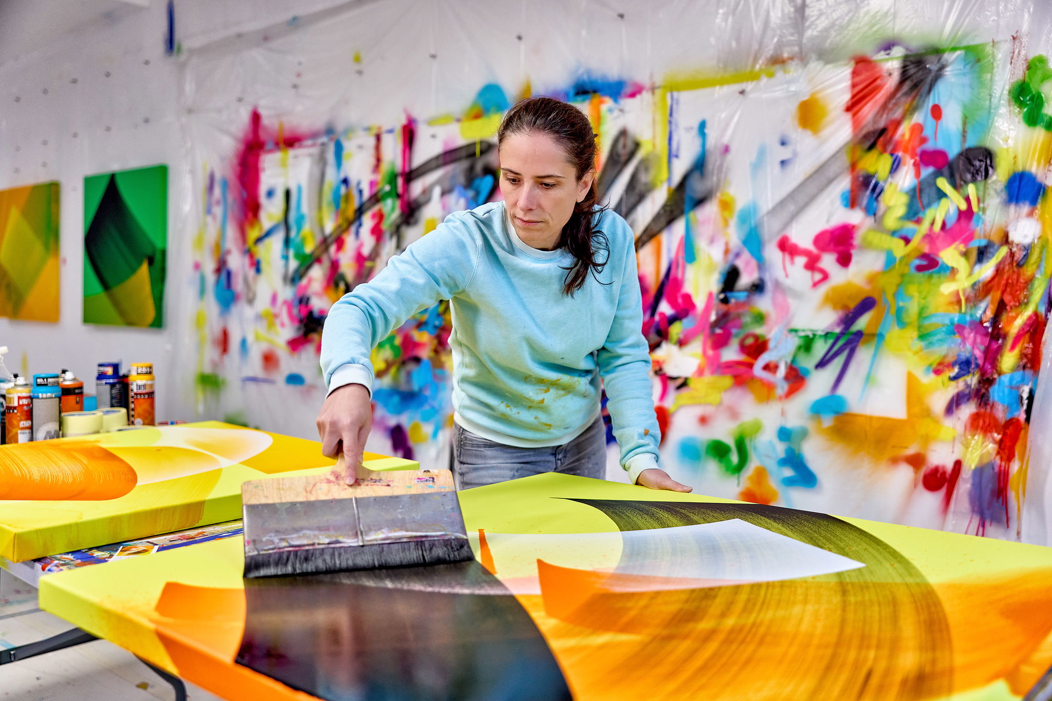MadC employs a gestural, fast-moving abstract language that captures the vibrancy of urban spaces. The artist develops her compositions by working in layers, using tools such as spray cans, brushes and spatulas to create varying effects in paint and build tactile surfaces. This immediacy invites viewers to engage with both the process of its making and the finished piece.
