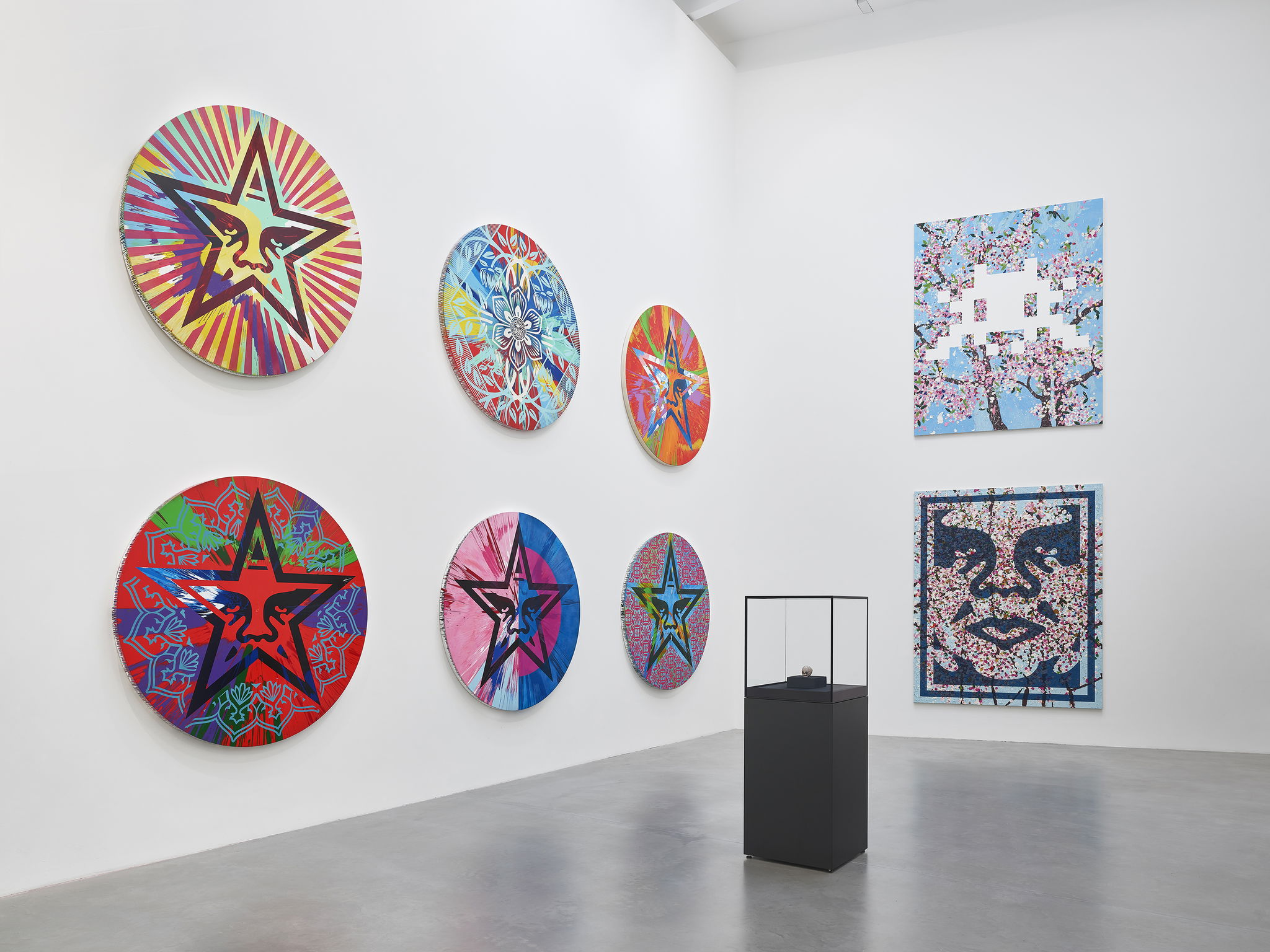 InvadHirst showcases the exciting common ground between Invader and Hirst’s practices and sheds new light on some of their long-established ideas. The grid structure of InvadHirst is a characteristic of Hirst’s Spot Paintings, but it also evokes the organisation of Space Invader characters in the arcade game that inspired Invader's motif. Invader creates the spot-like, pixelated creatures that occupy this grid from his wide-ranging palette of tiles, ensuring that, like in Hirst's Spot Paintings, no two are the same colour.