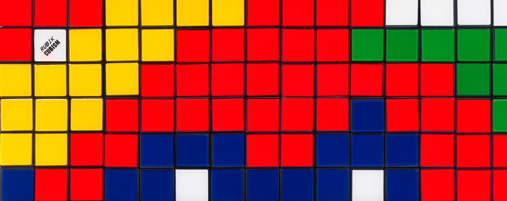 Begun in 2005, Invader's 'Rubikcubism' series of sculptures constructs images solely using the six-colour palette and square tiles found on a Rubik's Cube. In doing so, the resulting images convey a similar impact to the abstractions of Pointillism or Cubism, with the subject of the artwork made visible only through physical distance or when viewed through a smartphone.
