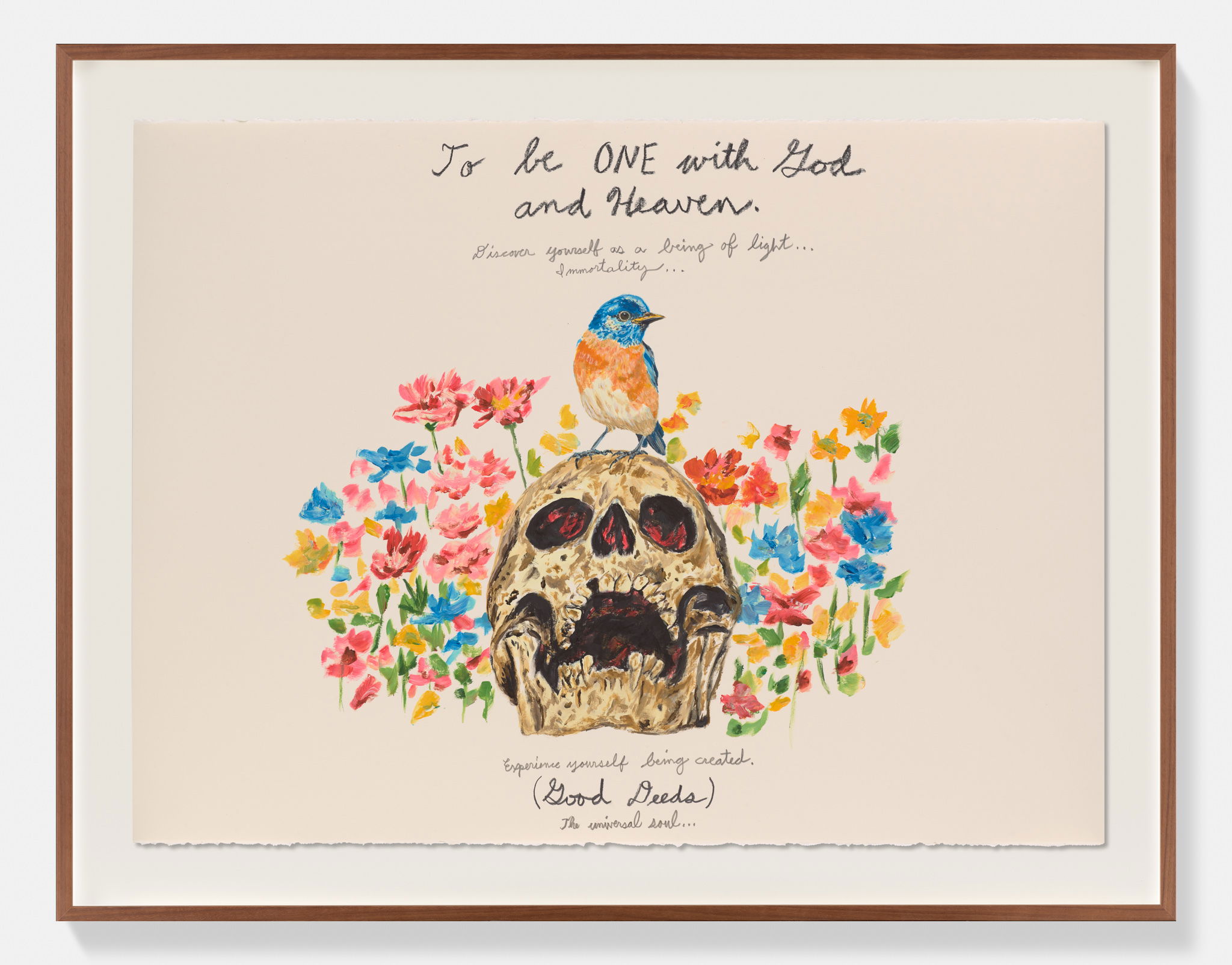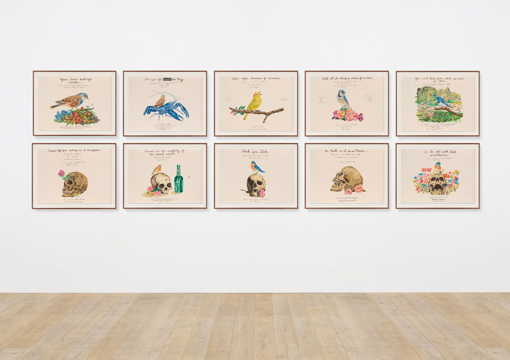 The works in Thank You God, produced in 2025, are populated by various types of birds, skulls and flowers as well as cursive text. Lang has long depicted birds, using it as symbols for positivity, hope and people in his life. The motif is drawn from memories of his grandmother who loved birds and particularly bluebirds, which became a major subject in his work after she died. In these new works he returns to birds as a symbol for somebody who hasn’t been born yet – his newest child, who was born two days after Lang completed the series. Reflecting on the process of making Thank You God, Lang says, ‘These [works] helped me navigate the anticipation, joy, fear and all the other feelings that go along with a new child coming.’