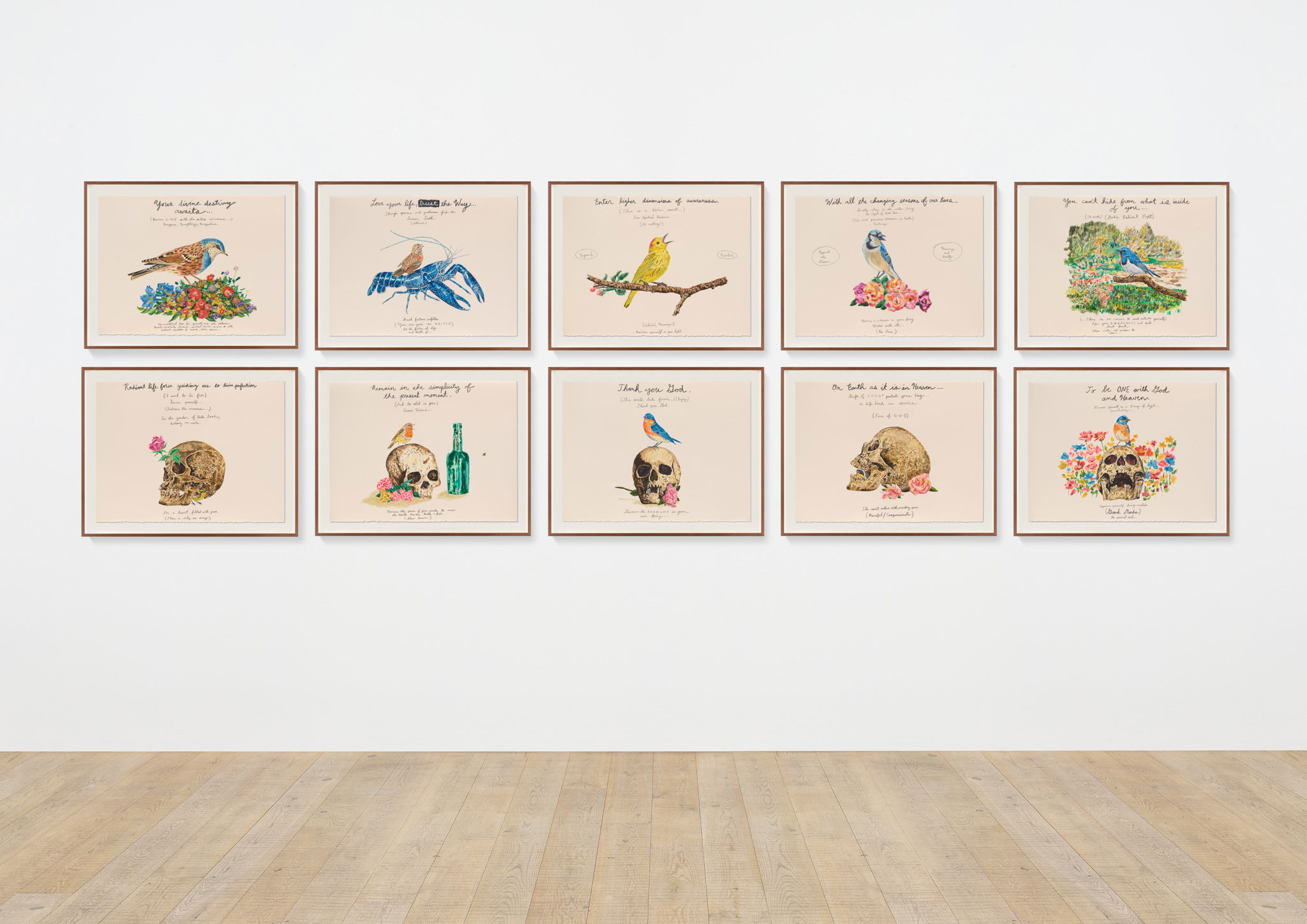 The works in Thank You God, produced in 2025, are populated by various types of birds, skulls and flowers as well as cursive text. Lang has long depicted birds, using it as symbols for positivity, hope and people in his life. The motif is drawn from memories of his grandmother who loved birds and particularly bluebirds, which became a major subject in his work after she died. In these new works he returns to birds as a symbol for somebody who hasn’t been born yet – his newest child, who was born two days after the original series was completed. Reflecting on the process of making Thank You God, Lang says, ‘These [works] helped me navigate the anticipation, joy, fear and all the other feelings that go along with a new child coming.’