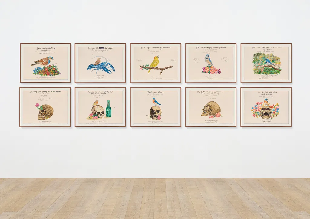 The works in Thank You God, produced in 2025, are populated by various types of birds, skulls and flowers as well as cursive text. Lang has long depicted birds, using it as symbols for positivity, hope and people in his life. The motif is drawn from memories of his grandmother who loved birds and particularly bluebirds, which became a major subject in his work after she died. In these new works he returns to birds as a symbol for somebody who hasn’t been born yet – his newest child, who was born two days after the series was completed. Reflecting on the process of making Thank You God, Lang says, ‘These [works] helped me navigate the anticipation, joy, fear and all the other feelings that go along with a new child coming.’