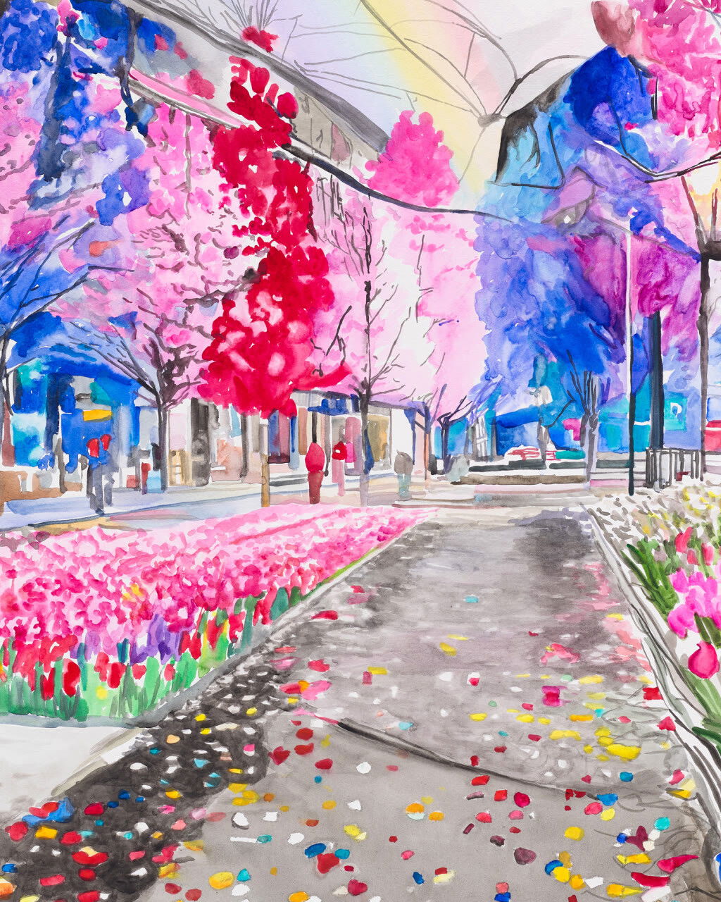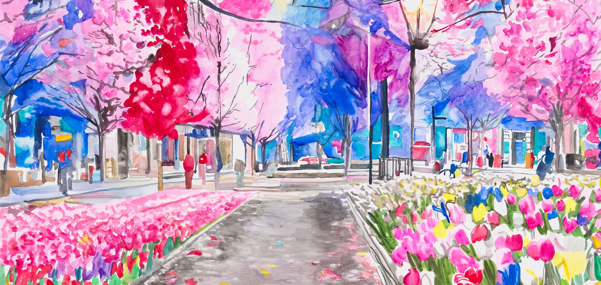 In The Civilisation Watercolours, Hirst explores the necessity of hope despite the complexities and challenges of contemporary civilisation, a theme first seen in his The Civilisation Paintings series. Using vibrant, optimistic colour, Hirst depicts memories or feelings of cities as bright, imagined landscapes in which flourishing plant life is set within urban environments. His scenes reveal an attempt to control the chaos of nature, observed in the planned-out pathways and curated arrangement of flora and trees. These artificial interventions in the landscapes are echoed in the grid-like structures of the buildings.