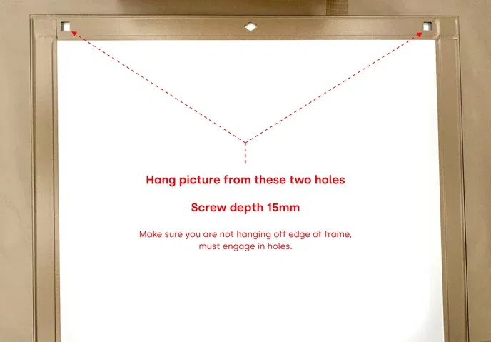First, insert screws into the wall, carefully positioned to align with the frame's two cutouts (located in the top left and top right corners on the back). The screws need to be long enough to extend out from the wall by around 15mm. Once the screws are in place, hang the frame by hooking these cutouts over the screws. Make sure not to place the screws on the narrow edge of the frame, as this won't provide proper support.