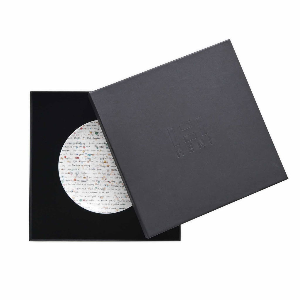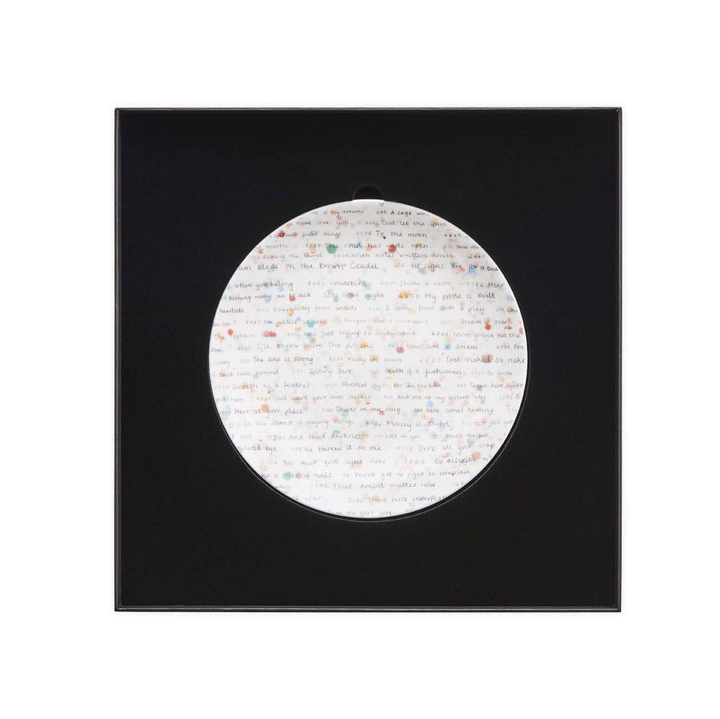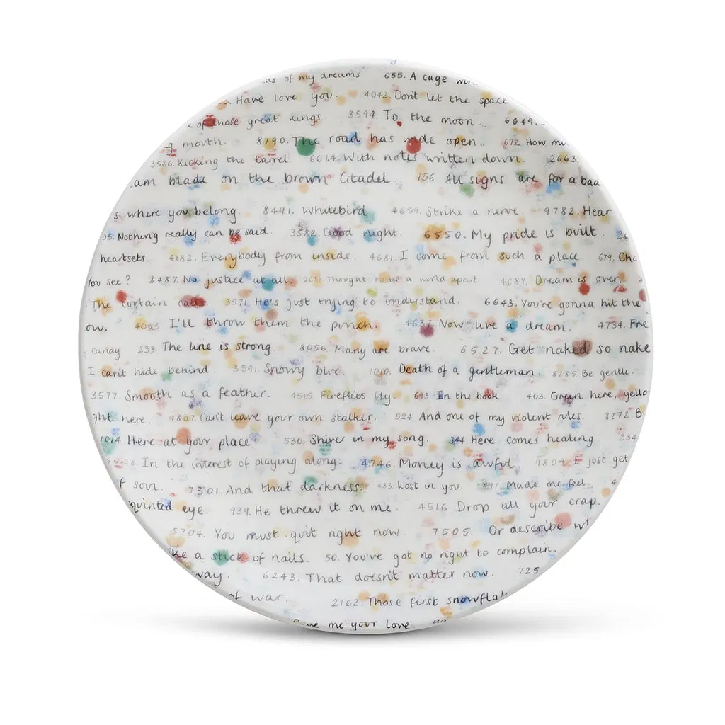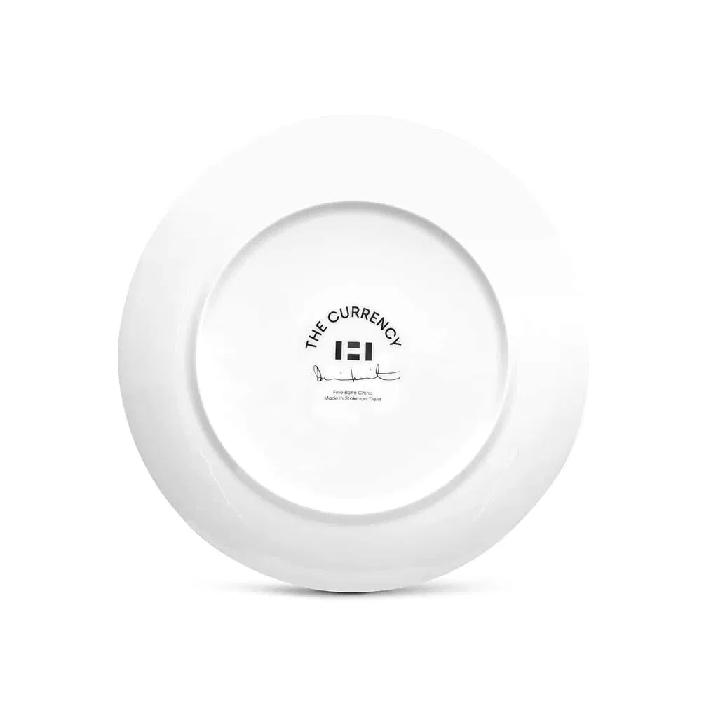 English Fine Bone China digitally printed with a design showing titles and paint spots that appear on the back of The Currency artworks. Made in Stoke-on-Trent, a city world-renowned for its ceramic industry.