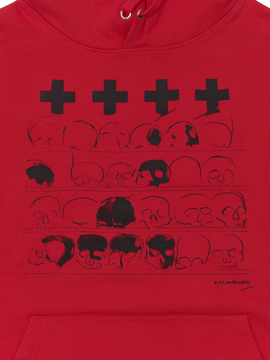 A red hoodie from Ossuary Study 1, featured in Brian Clarke's Exhibition, 'A Great Light'. The hoodie is printed in the UK and made from 85% Organic cotton and 15% recycled polyester.