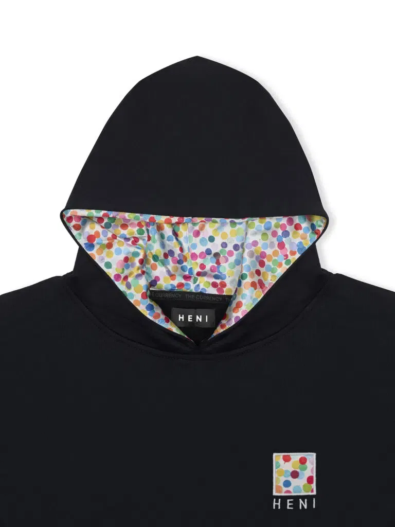A black hoodie, with a satin-lined hood and applique acronym, made up of brightly coloured dots taken from The Currency paintings. Cotton-modal blend fabric, sustainably made in Greece.