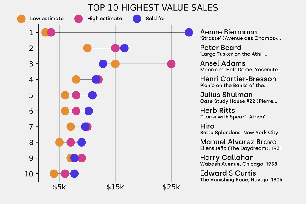 The star lot was: Aenne Biermann, 'Strasse' (Avenue des Champs-Élysées) (1931), which sold for $28,200, 1026% above its $2,500 low estimate. It has not been traded before.