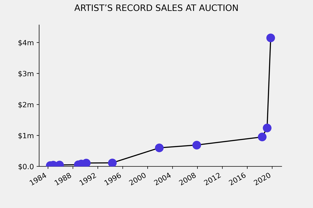 The sale beat the artist’s previous auction record by $2.91m, a 225% rise. His previous record was set by Ada And Louise (1987), which sold for $1.24m at Christie's on March 7, 2019.