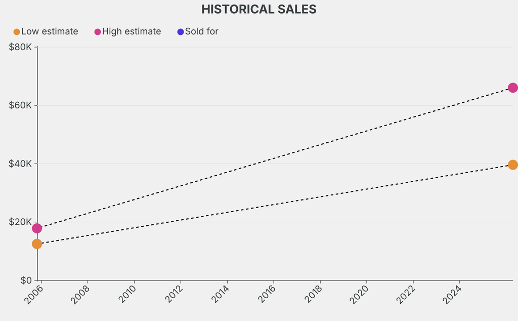 It last sold at auction in 2005 for $12,500 at Sotheby's. The current low estimate is 217% higher than its previous low estimate of $12,500.