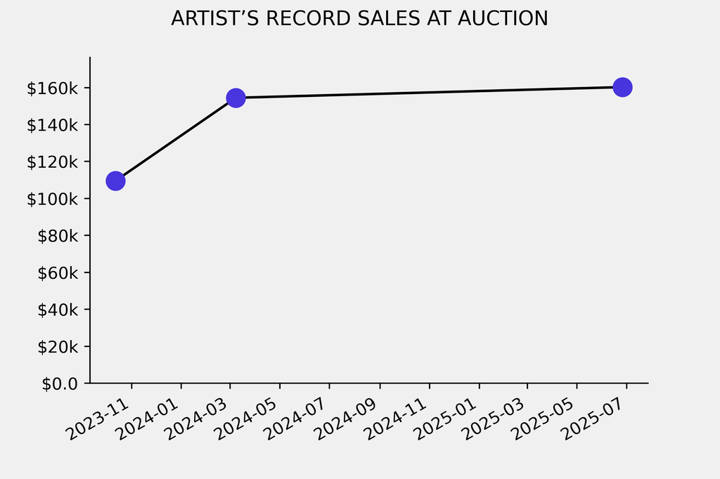 The sale beat the artist’s previous auction record by $5,789, a 3% rise. His previous record was set by Interior with Sunflowers at Sunset (2020), which sold for $154,500 at Phillips on March 8, 2024. The work had not been traded before.