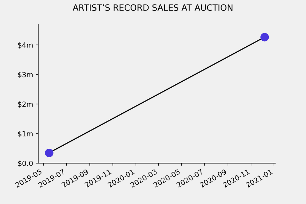 The sale beat the artist’s previous auction record by $3.92m, a 1,100% rise. Her previous record was set by Innocent You, Innocent Me (2016), which sold for $350,000 at Christie's on May 16, 2019. The work had been traded once in the past.