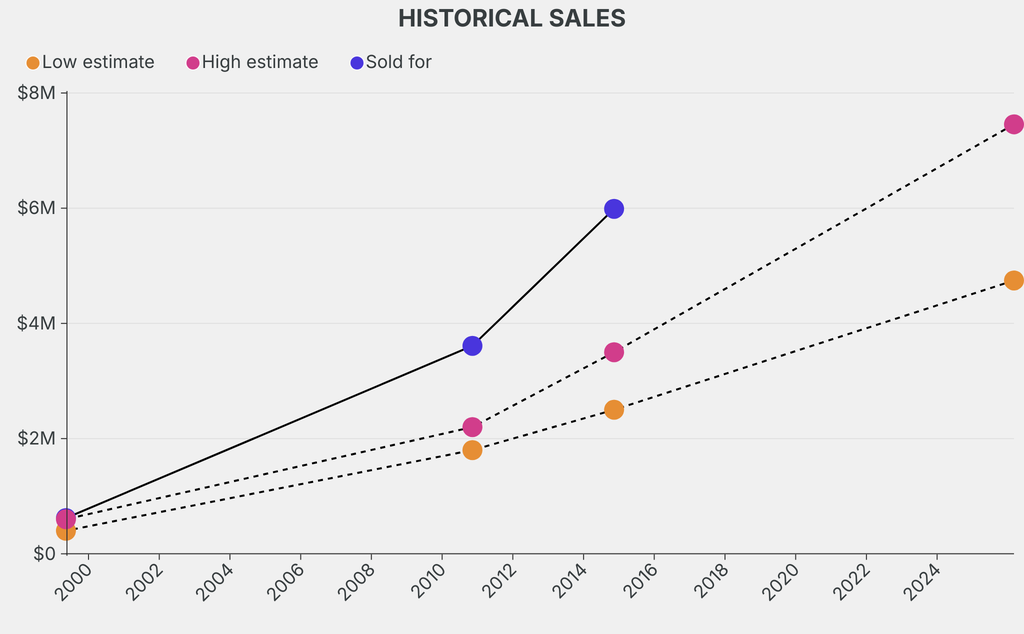 It last sold at auction in 2014 for $5.99m at Christie's. The current low estimate is 89% higher than its previous low estimate of $2.5m.