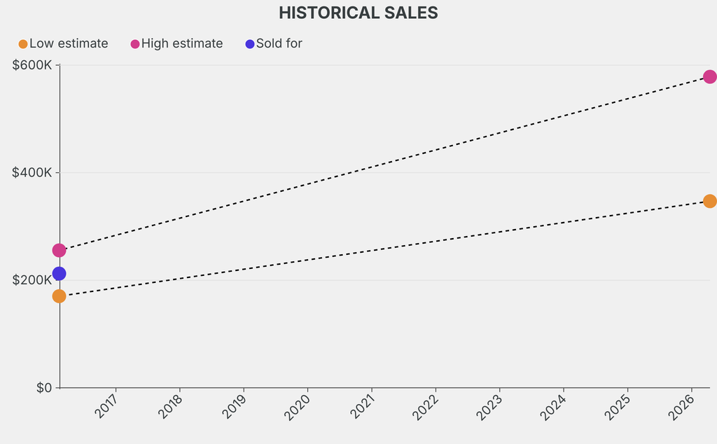 It last sold at auction in 2016 for $212,400 at Christie's. The current low estimate is 103% higher than its previous low estimate of $170,400.