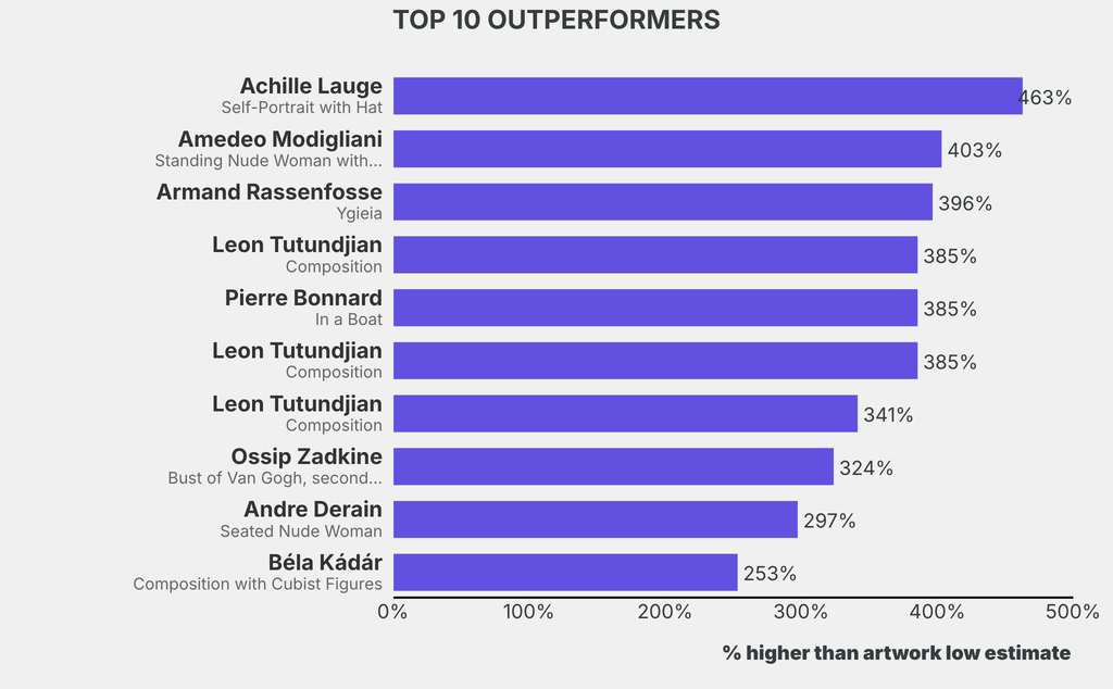 The outperformer sold for 462% above its low estimate. Achille Lauge, Self-Portrait with Hat (1925), sold for $26,600 ($4,726 low estimate).