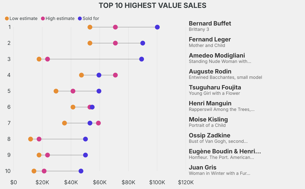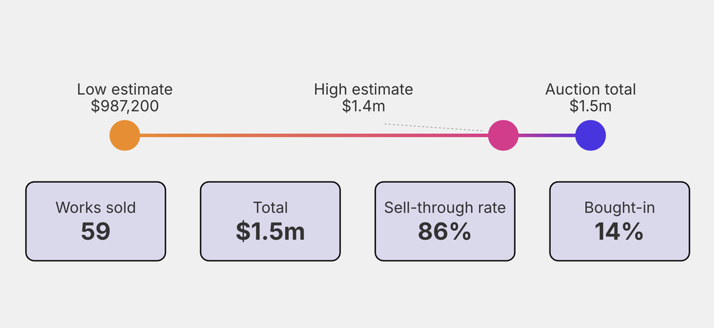 All results include the fees and premiums added to the price of a work of art when the auctioneer's hammer falls. Estimates, sale prices and totals are converted into US dollars. Sale prices are compared to the auction house’s low estimate, which do not include premiums.