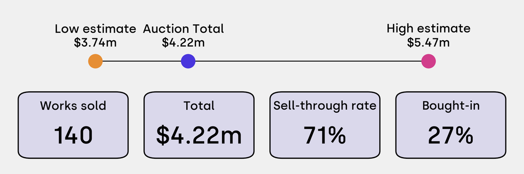All results include the fees and premiums added to the price of a work of art when the auctioneer's hammer falls. Estimates, sale prices and totals are converted into US dollars. Sale prices are compared to the auction house’s low estimate, which do not include premiums.