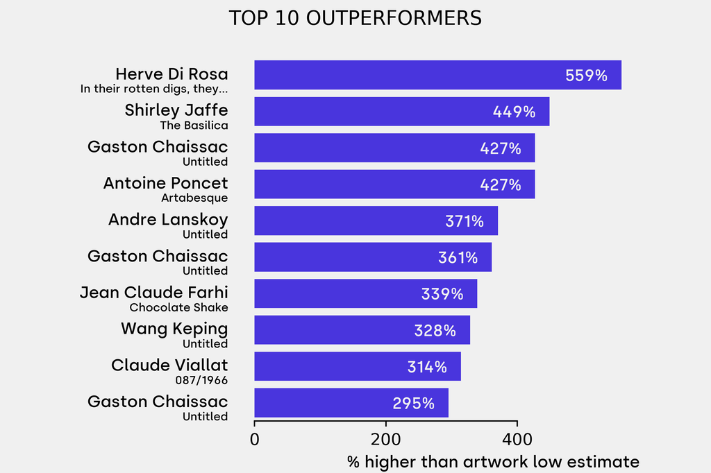 The outperformer sold for 558% above its low estimate. Herve Di Rosa, In their rotten digs, they dream of a better world (1984), sold for $60,100 ($9,128 low estimate).