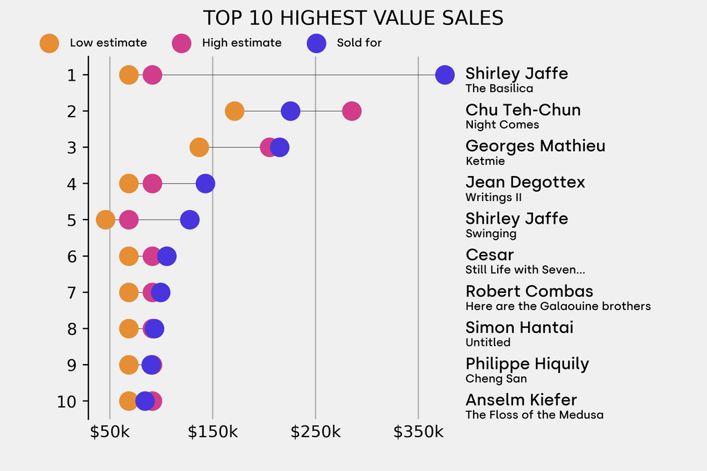 The star lot was: Shirley Jaffe, The Basilica (1994), which sold for $375,800, 448% above its $68,500 low estimate.