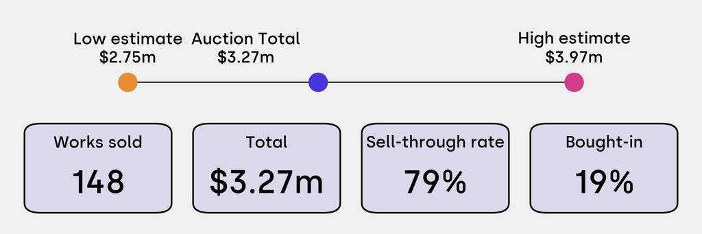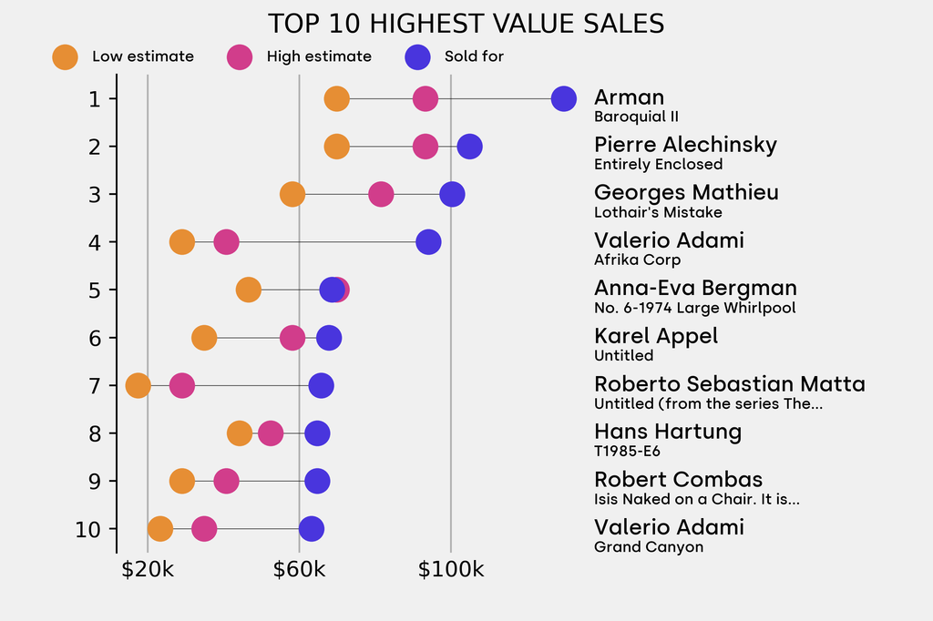 All results include the fees and premiums added to the price of a work of art when the auctioneer's hammer falls. Estimates, sale prices and totals are converted into US dollars. Sale prices are compared to the auction house’s low estimate, which do not include premiums.