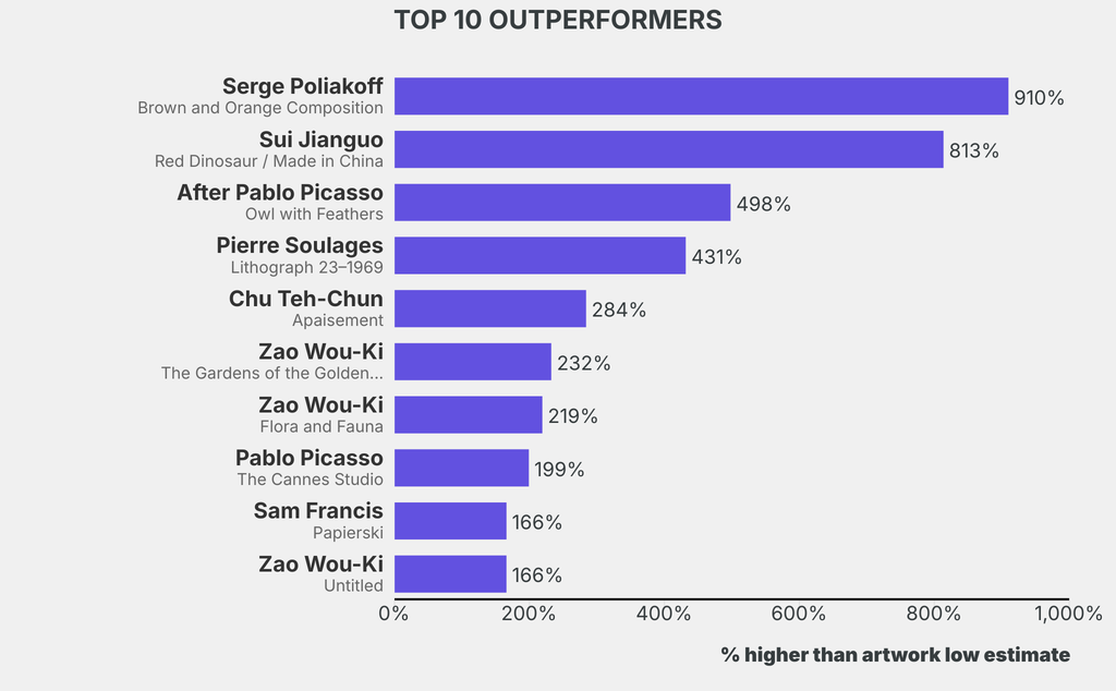 The outperformer sold for 909% above its low estimate. Serge Poliakoff, Brown and Orange Composition (1961), sold for $5,780 ($572 low estimate).