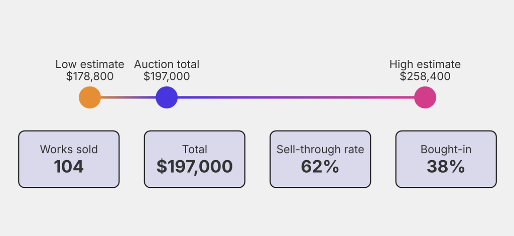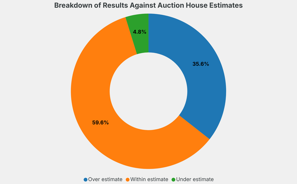 All results include the fees and premiums added to the price of a work of art when the auctioneer's hammer falls. Estimates, sale prices and totals are converted into US dollars. Sale prices are compared to the auction house’s low estimate, which do not include premiums.