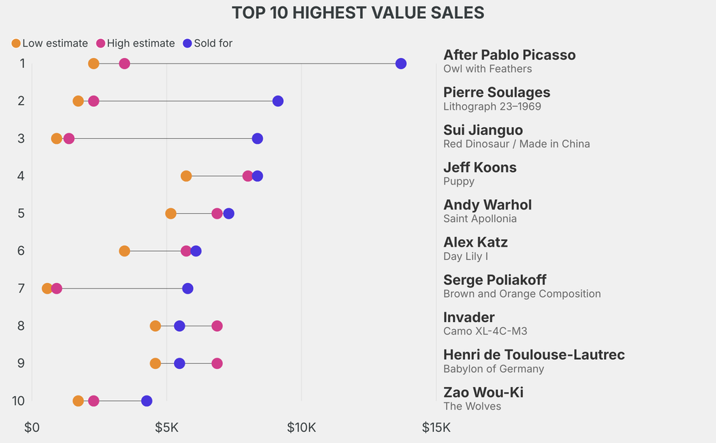 The star lot was: After Pablo Picasso, Owl with Feathers (1951), which sold for $13,700, 497% above its $2,290 low estimate.