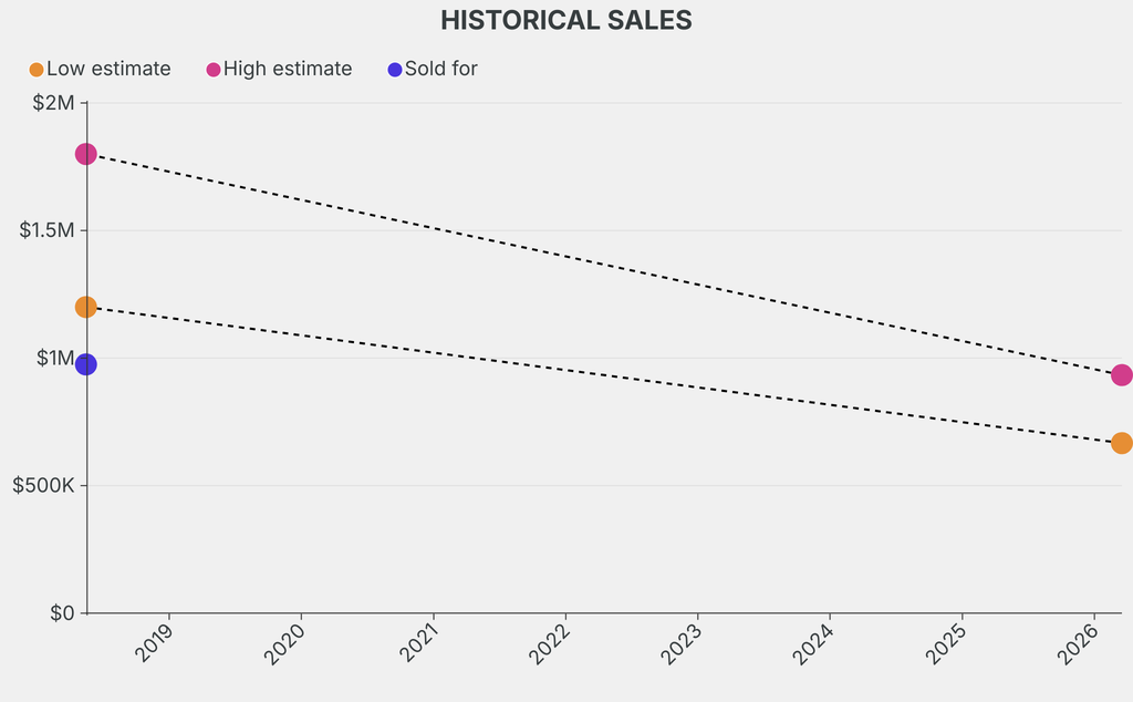 It last sold at auction in 2018 for $975,000 at Sotheby's. The current low estimate is 44% lower than its previous low estimate of $1.2m.