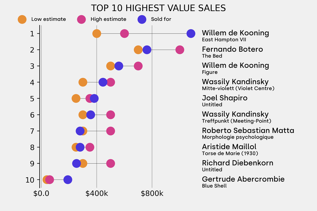 The star lot was: Willem de Kooning, East Hampton VII (1968), which sold for $1.08m, 170% above its $400,000 low estimate. It has been traded 3 times in the past.
