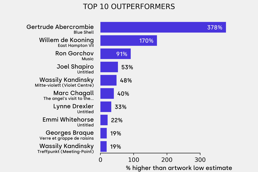 All results include the fees and premiums added to the price of a work of art when the auctioneer's hammer falls. Sale prices are compared to the auction house’s low estimate, which do not include premiums.