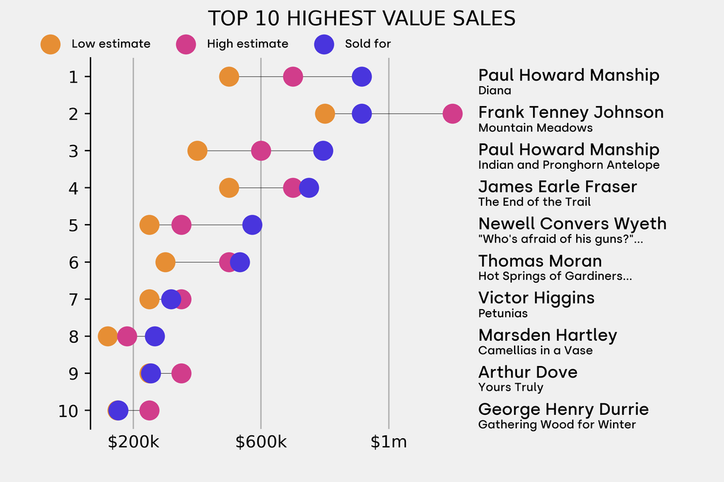 29 works were bought-in, including: Winold Reiss, Falling Over the Bank (1928), estimated at $600,000 (low) to $800,000 (high). It has been traded 6 times in the past.