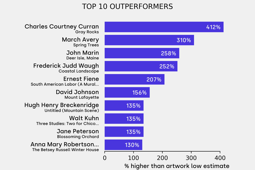 The outperformer sold for 412% above its low estimate. Charles Courtney Curran, Gray Rocks (1928), sold for $20,500 ($4,000 low estimate). It has been traded once in the past.