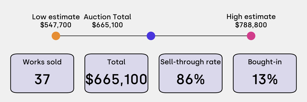 All results include the fees and premiums added to the price of a work of art when the auctioneer's hammer falls. Estimates, sale prices and totals are converted into US dollars. Sale prices are compared to the auction house’s low estimate, which do not include premiums.
