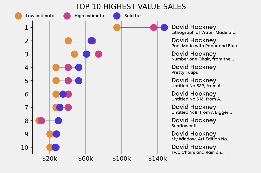 The outperformer sold for 264% above its low estimate. David Hockney, Sunflower II (1995), sold for $29,600 ($8,136 low estimate).