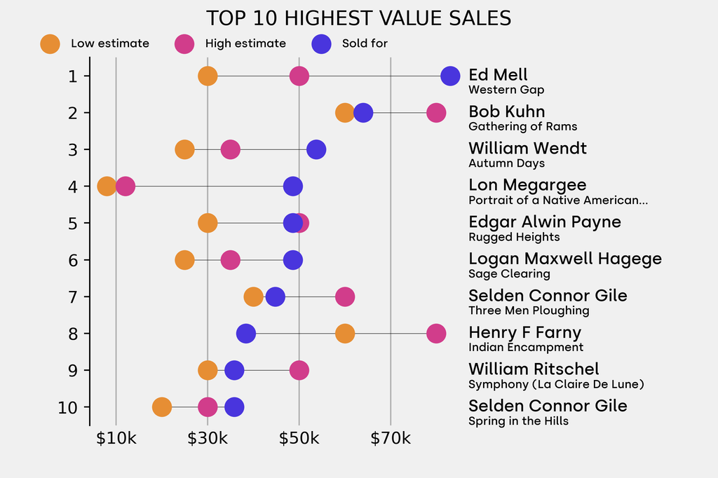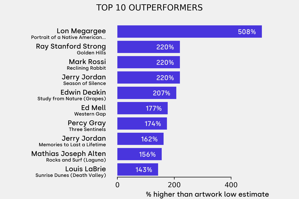 The star lot was: Ed Mell, Western Gap (2021), which sold for $83,000, 176% above its $30,000 low estimate. It has been traded once in the past.