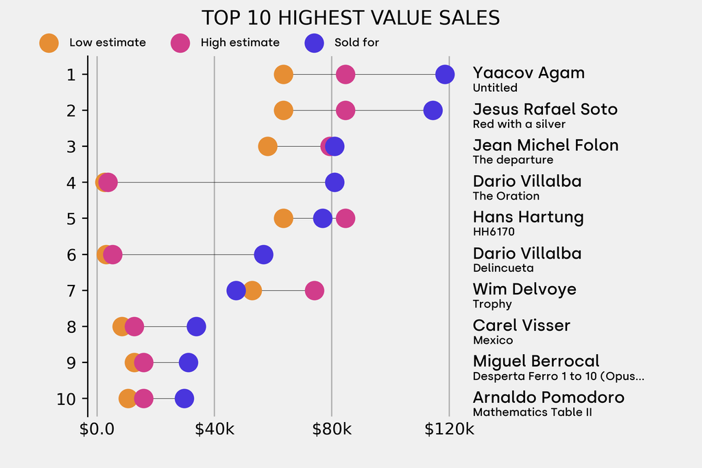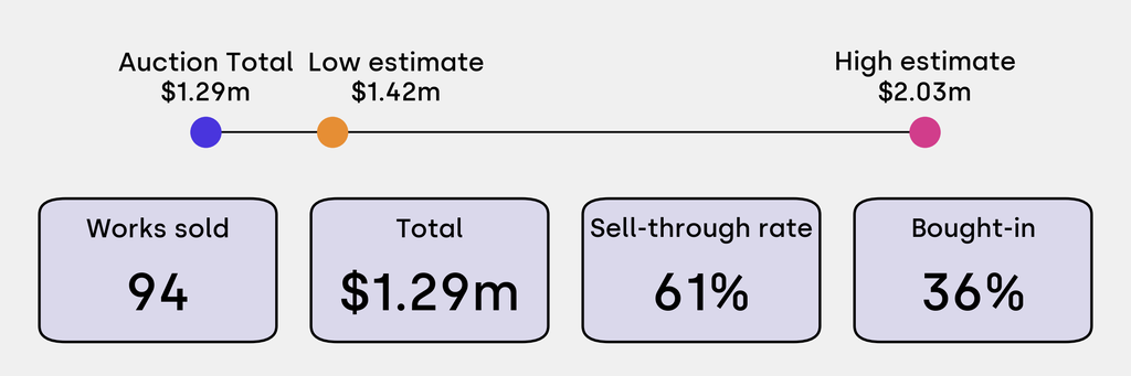 All results include the fees and premiums added to the price of a work of art when the auctioneer's hammer falls. Estimates, sale prices and totals are converted into US dollars. Sale prices are compared to the auction house’s low estimate, which do not include premiums.