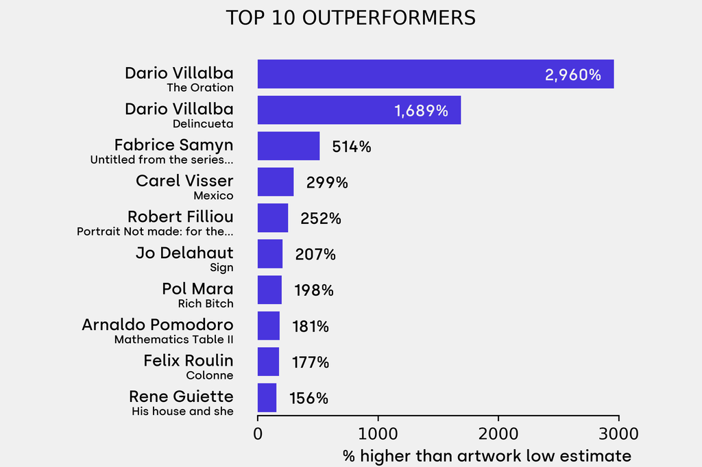 The outperformer sold for 2960% above its low estimate. Dario Villalba, The Oration (1974), sold for $80,900 ($2,644 low estimate).