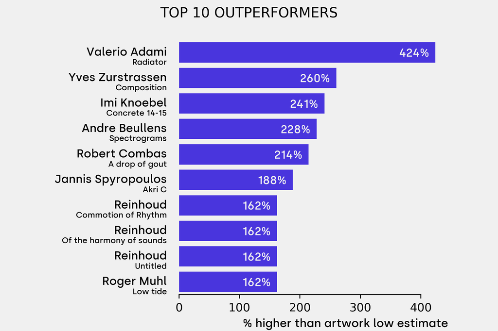 The outperformer sold for 424% above its low estimate. Valerio Adami, Radiator (1969), sold for $11,600 ($2,215 low estimate).
