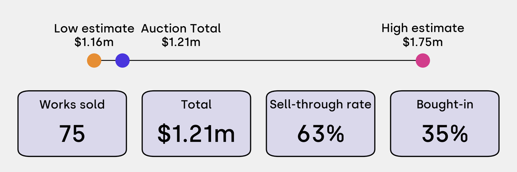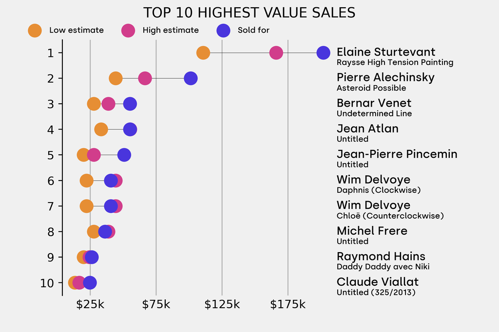 All results include the fees and premiums added to the price of a work of art when the auctioneer's hammer falls. Estimates, sale prices and totals are converted into US dollars. Sale prices are compared to the auction house’s low estimate, which do not include premiums.
