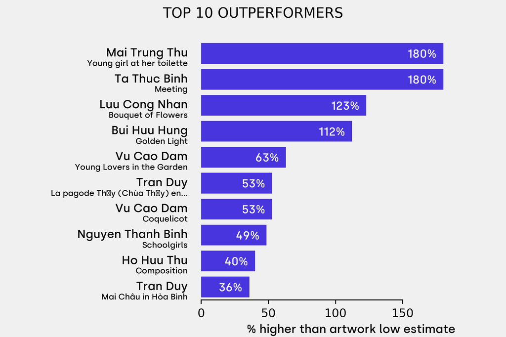 The outperformer sold for 180% above its low estimate. Mai Trung Thu, Young girl at her toilette (1960), sold for $1,477 ($527 low estimate).