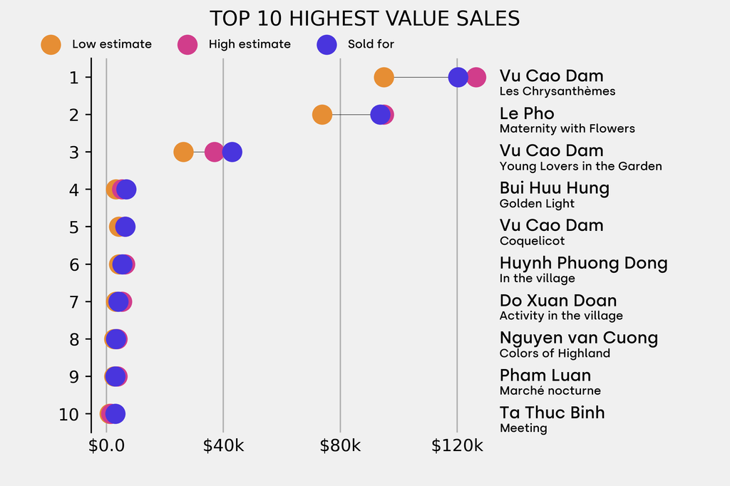 The star lot was: Vu Cao Dam, Les Chrysanthèmes (1949), which sold for $120,300, 26% above its $94,900 low estimate. It has not been traded before.