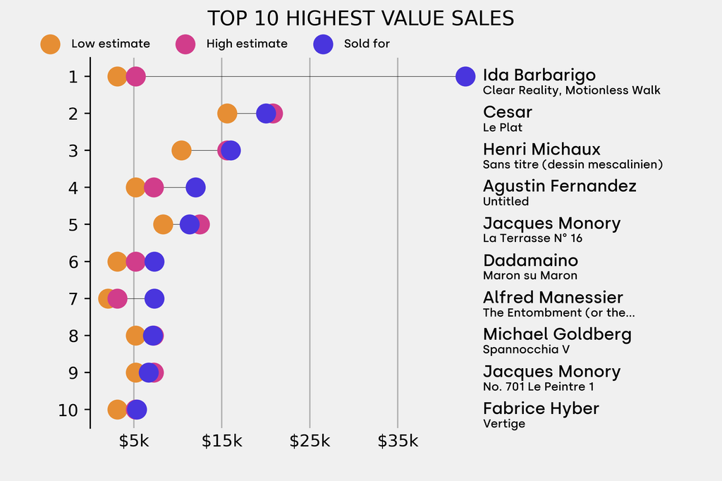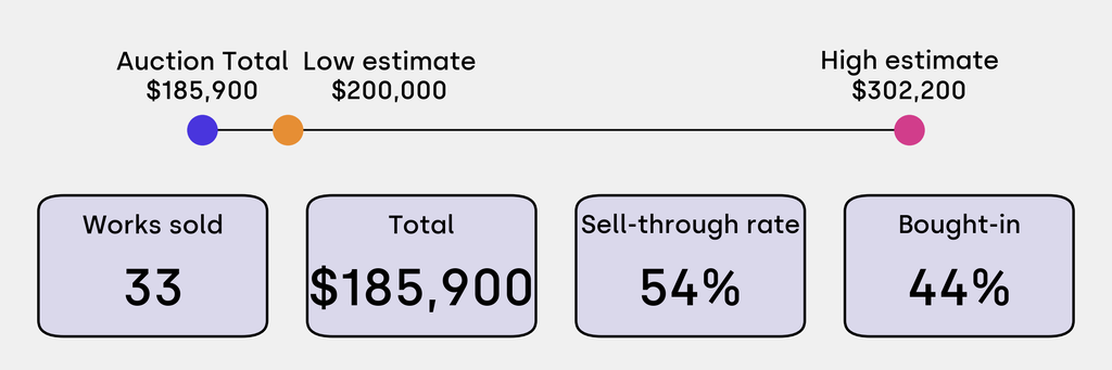 All results include the fees and premiums added to the price of a work of art when the auctioneer's hammer falls. Estimates, sale prices and totals are converted into US dollars. Sale prices are compared to the auction house’s low estimate, which do not include premiums.