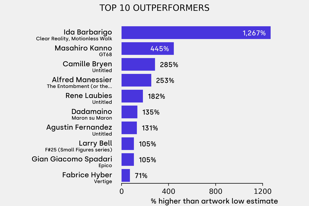 The outperformer sold for 1267% above its low estimate. Ida Barbarigo, Clear Reality, Motionless Walk (1962), sold for $42,700 ($3,120 low estimate). It has been traded once in the past.